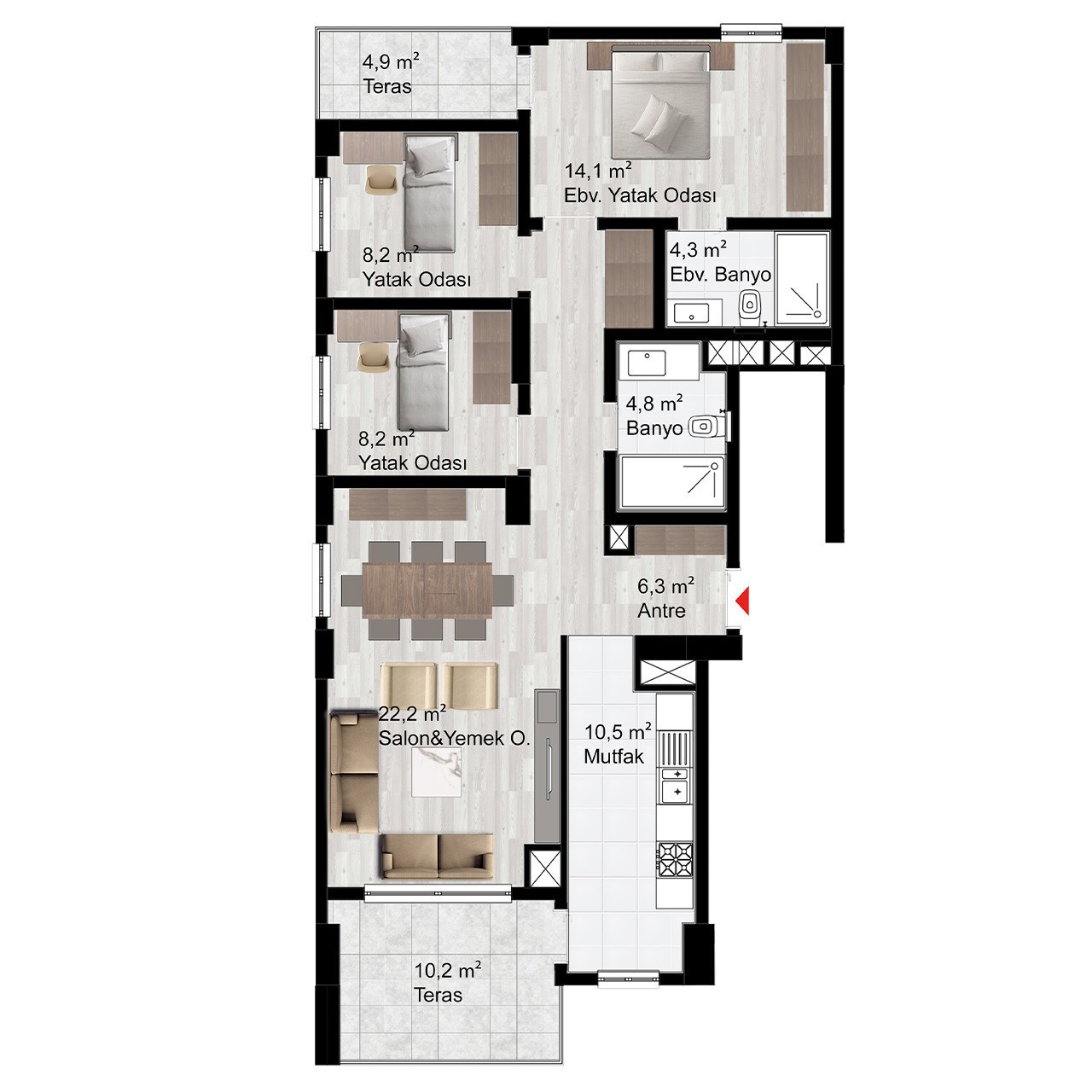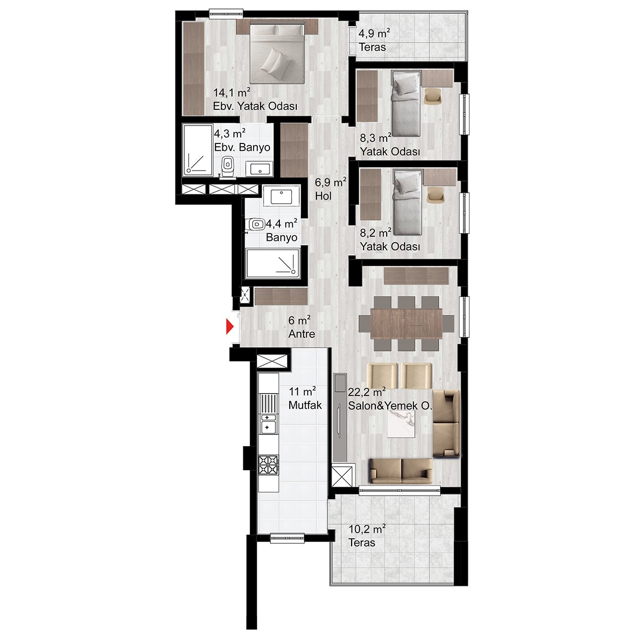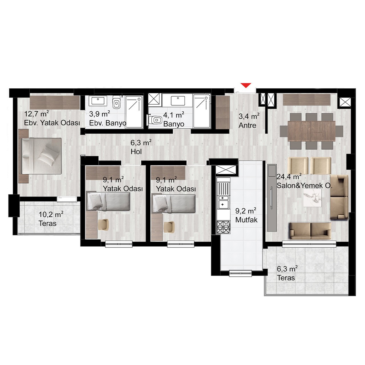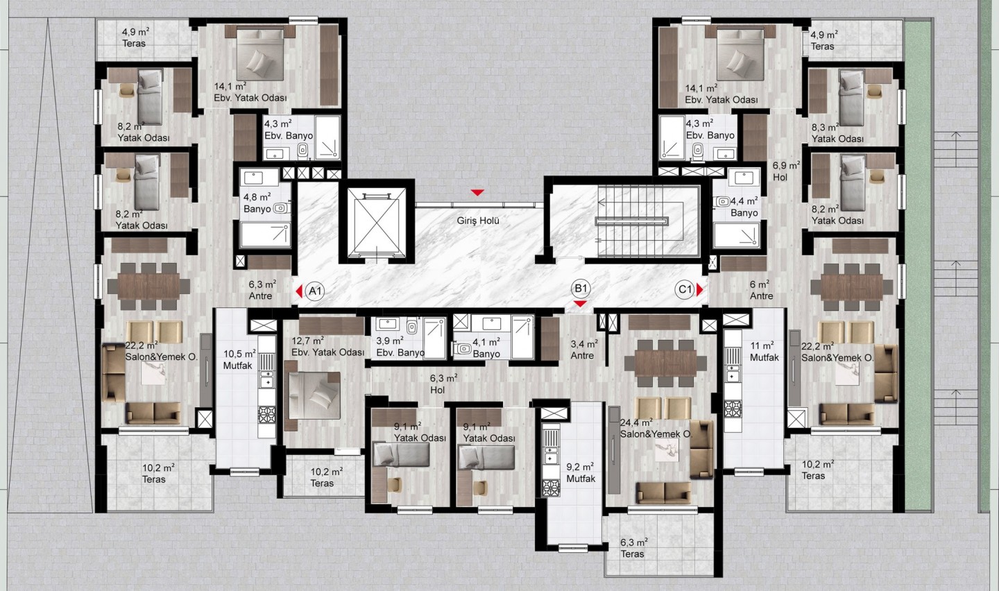 Davlumbaz, ocak ve fırın olmak üzere her daire mutfağında 3’lü ankastre seti bulunacaktır.