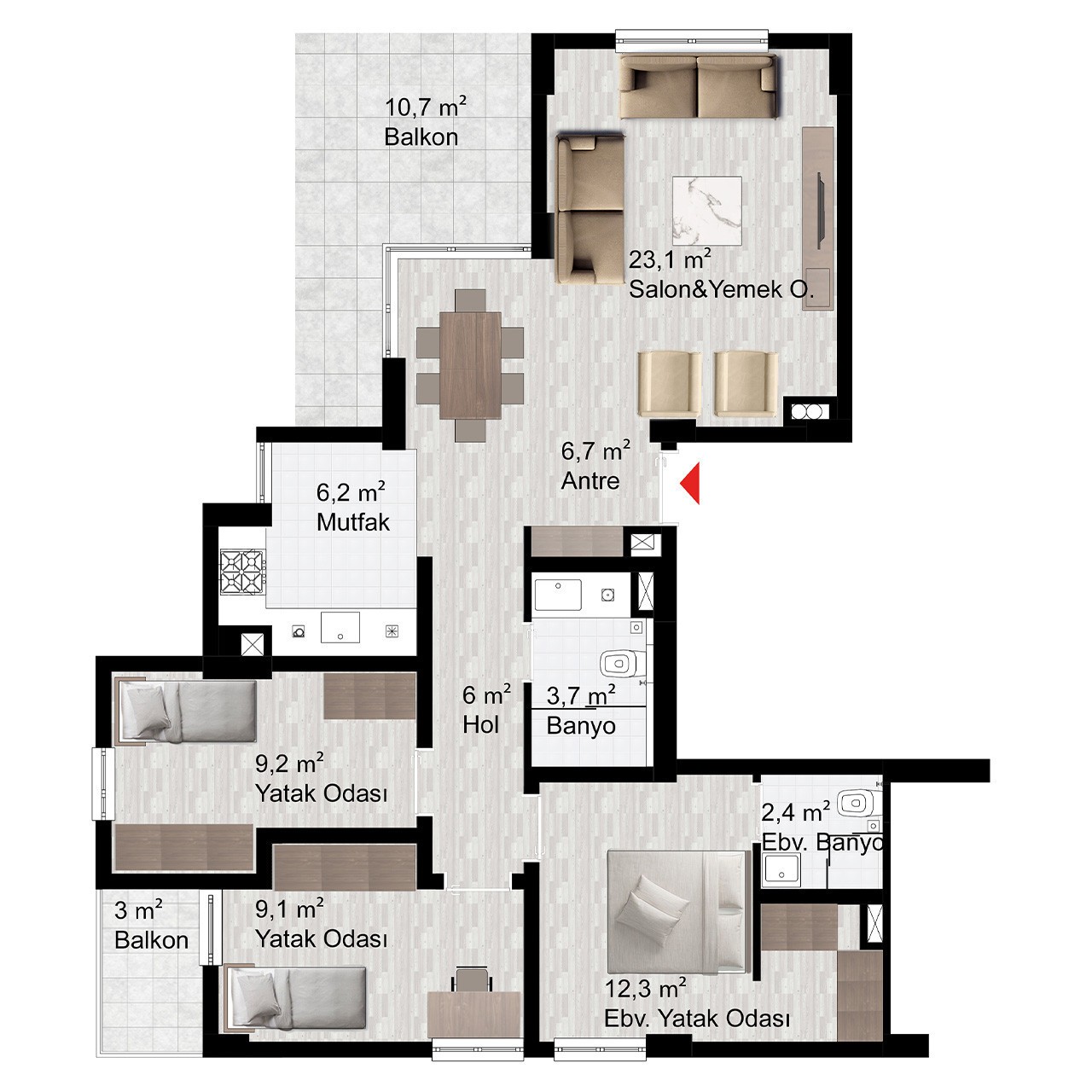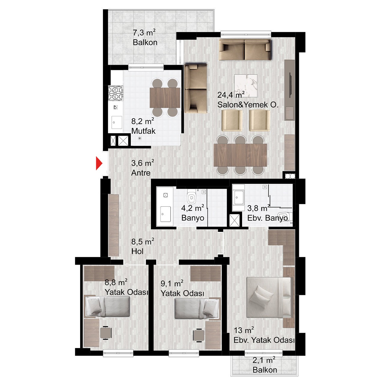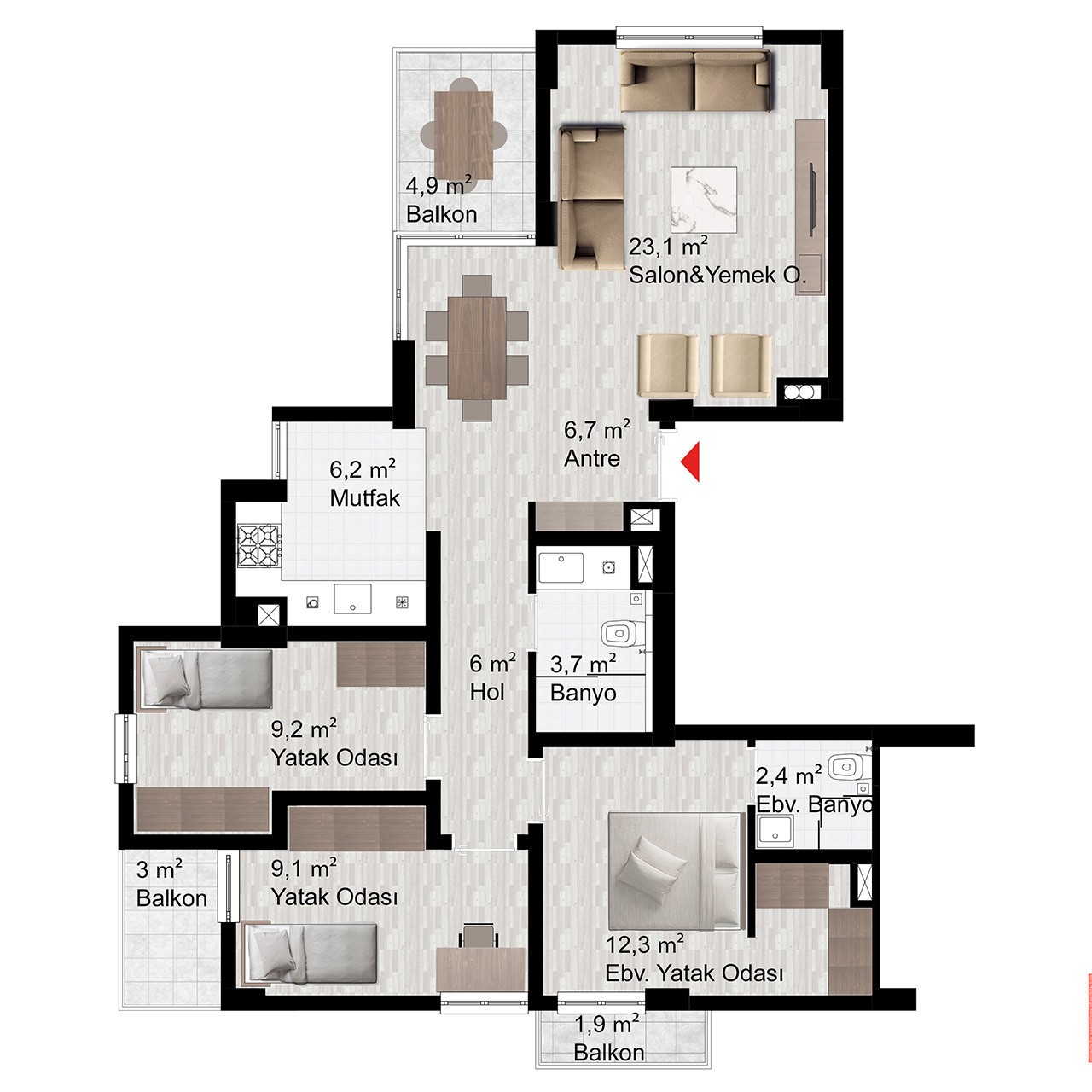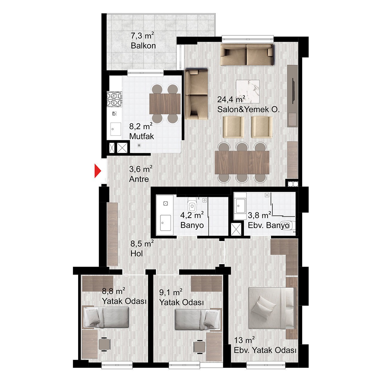 Davlumbaz, ocak ve fırın olmak üzere her daire mutfağında 3’lü ankastre seti bulunacaktır.